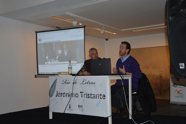 El escritor murciano Jerónimo Tristante presentó, en la noche de ayer, la novela "La última noche de Víctor Ros" en el ciclo Río de Letras acompañado por el crítico literario, José Belmonte.