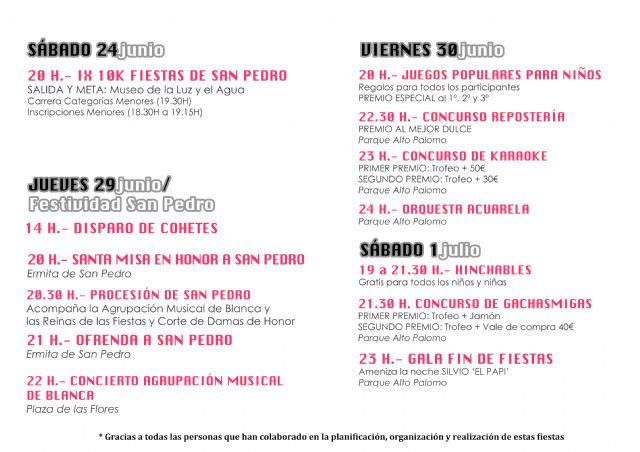 El jueves 29, Festividad de San Pedro, seguirán los actos con la procesión y ofrenda a San Pedro, y el concierto de la Agrupación Musical de Blanca. El viernes 30, los más pequeños podrán disfrutar de las fiestas con la realización de juegos populares. Seguidamente se realizarán los concursos de repostería,que cuenta con premios para el mejor dulce, y el karaoke, que premiará al ganador. Tras la finalización de los concursos, llegará la actuación de la Orquesta Acuarela.