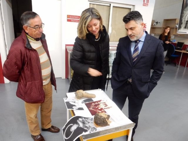 El director general de Bienes Culturales, Juan Antonio Lorca, acompañó hoy en el Centro de Restauración a la alcaldesa de Blanca, Esther Hortelano, y al cronista de la localidad, Ángel Ríos, quienes depositaron el fragmento de la talla, así como una cabeza del ángel que se cree que también pertenece al mismo conjunto escultórico, para que sea datada y se estudie su autoría.