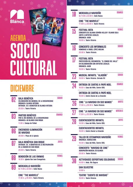 En el apartado artístico Los Informales celebrarán un concierto de homenaje a Ángel López Molina, el 16 de diciembre. Se desarrollará el Festival Rota, organizado por AADK, los días 15 y 17 de diciembre y que incluirá conciertos y la proyección de un documental; y la Agrupación Musical de Blanca dará el concierto 'Una Navidad de cine', el 29 de diciembre.