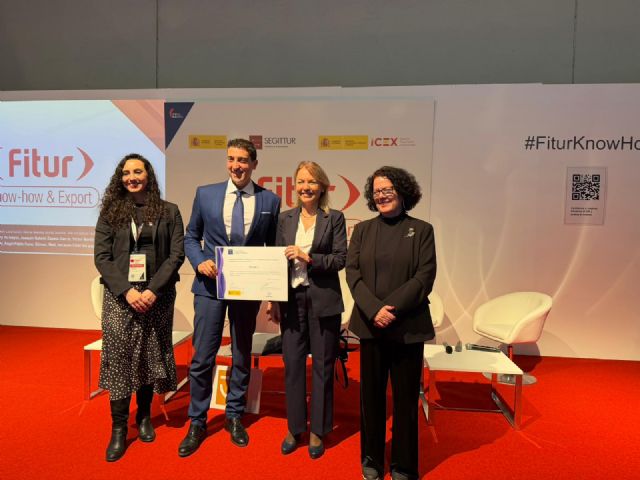 El diploma, que reconoce la mejora continua de los servicios turísticos del municipio, se ha entregado hoy en Fitur en un evento que ha contado con el alcalde de Blanca, Á. Pablo Cano, y la concejala de Turismo, Ana Lova.