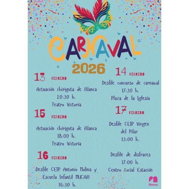 El Ayuntamiento de Blanca ha abierto el periodo de inscripciones para el desfile-concurso de Carnaval 2026 que se celebrará el sábado 14 de febrero, a las 17:30 horas en la Plaza de la Iglesia.